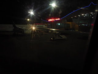 Some time during the night we landed at Almaty, Kazakhstan. Here some passengers got off and a few more got on. From the windows we could see the fantastic fleet of former soviet aircraft and some futuristic looking models reminiscent of Naboo starfighters. This and the bizarre high peaked caps of the local officials, arriving by Lada, gave a very surreal air to proceedings.